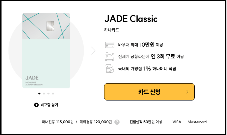 하나카드 제이드 클래식(JADE Classic) 연회비는 국내전용 115,000원, 해외겸용 12만원입니다